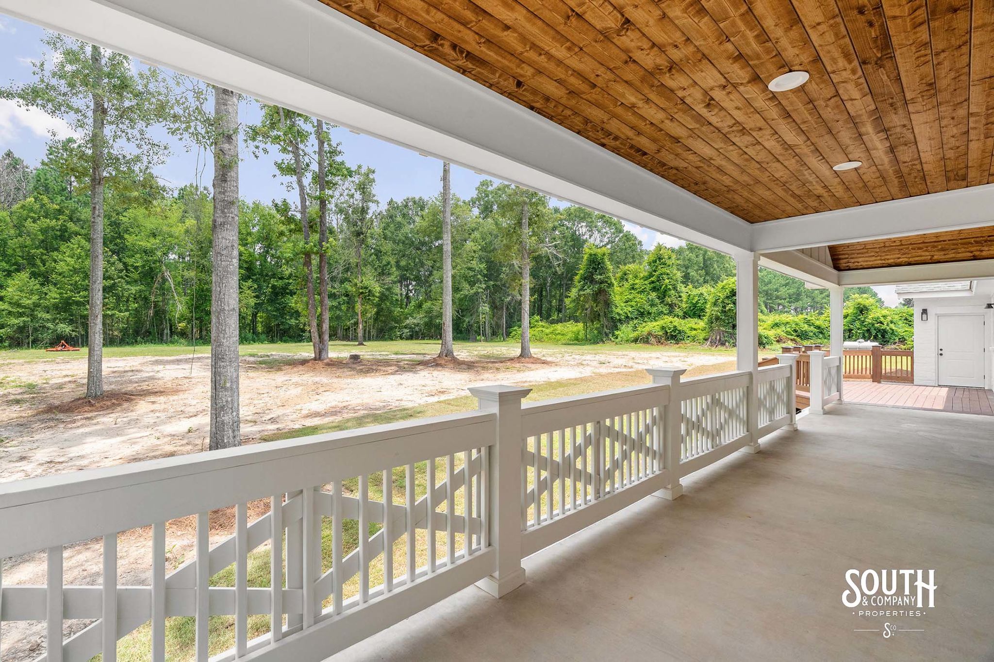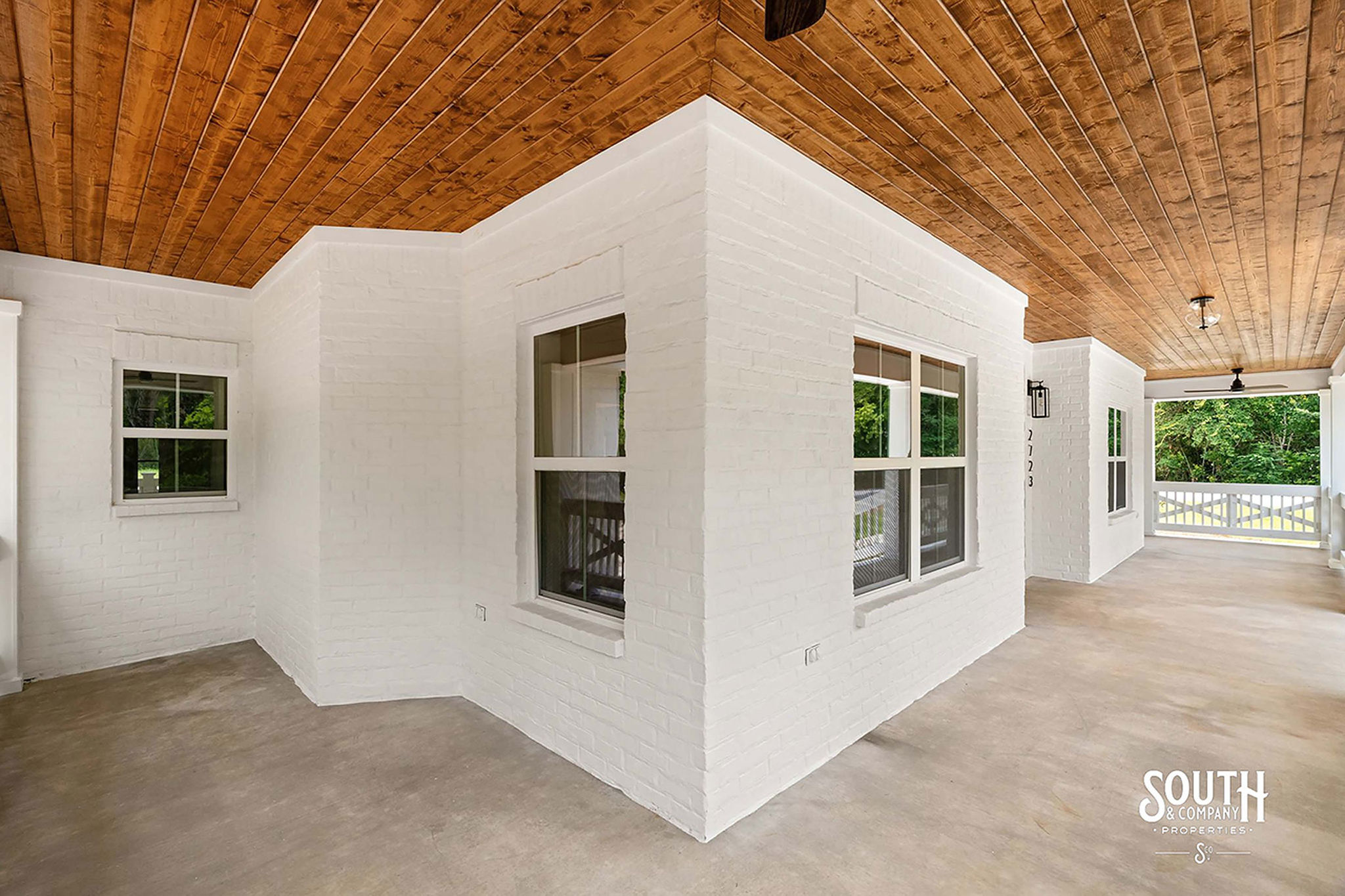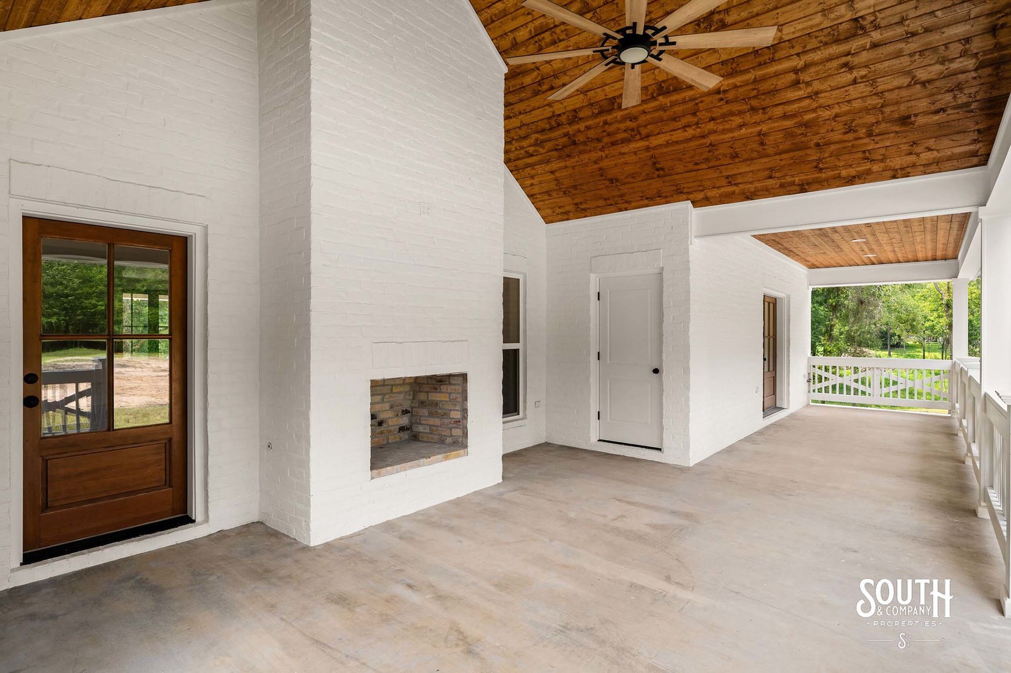 One of the home’s standout features is the outdoor living area. The spacious back porch has a vaulted tongue-and-groove ceiling and a wood burning outdoor fireplace—perfect for relaxing evenings, grilling, or entertaining friends. The front porch is equally impressive, with its elevated design, board-and-batten accents, and classic farmhouse appeal.
