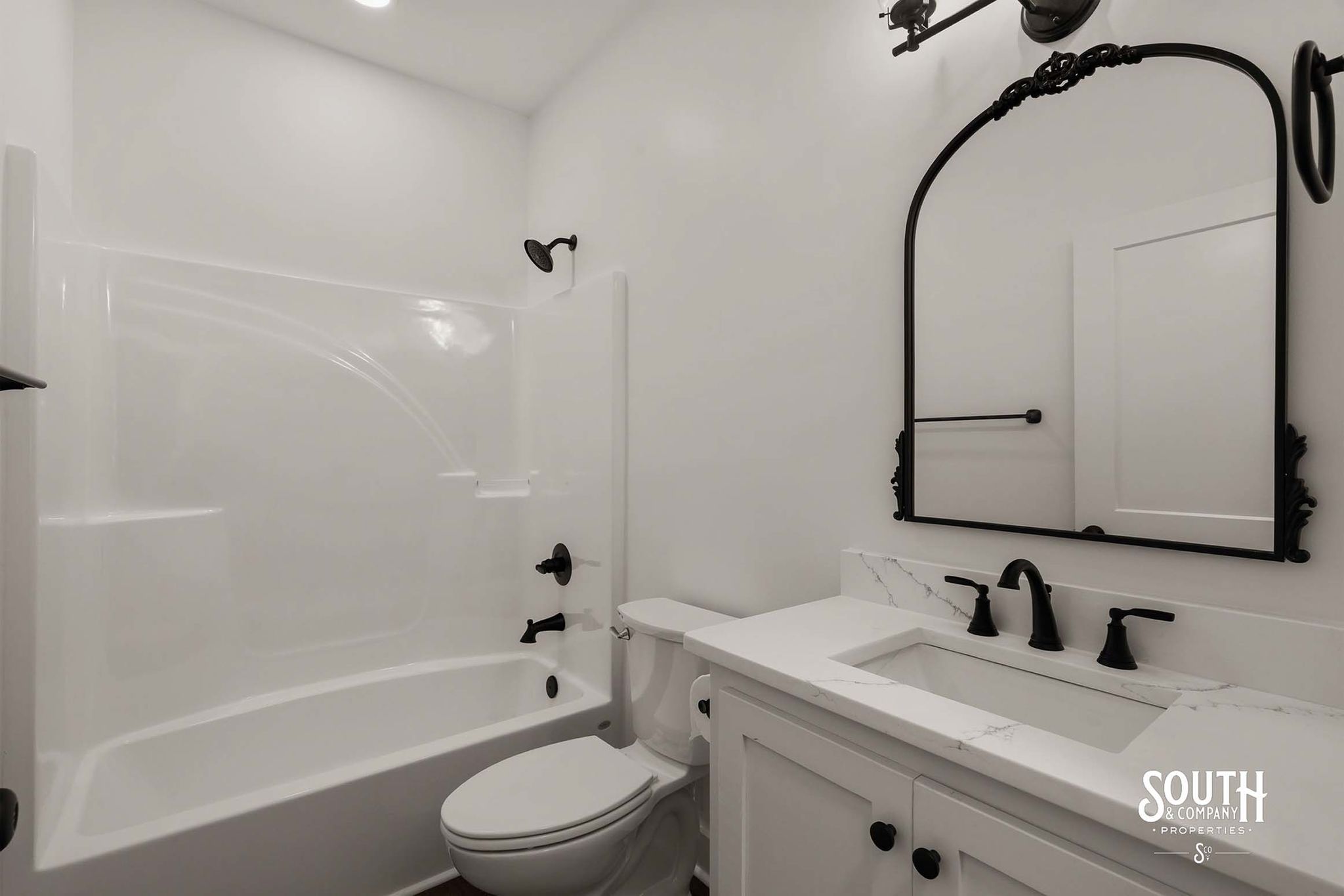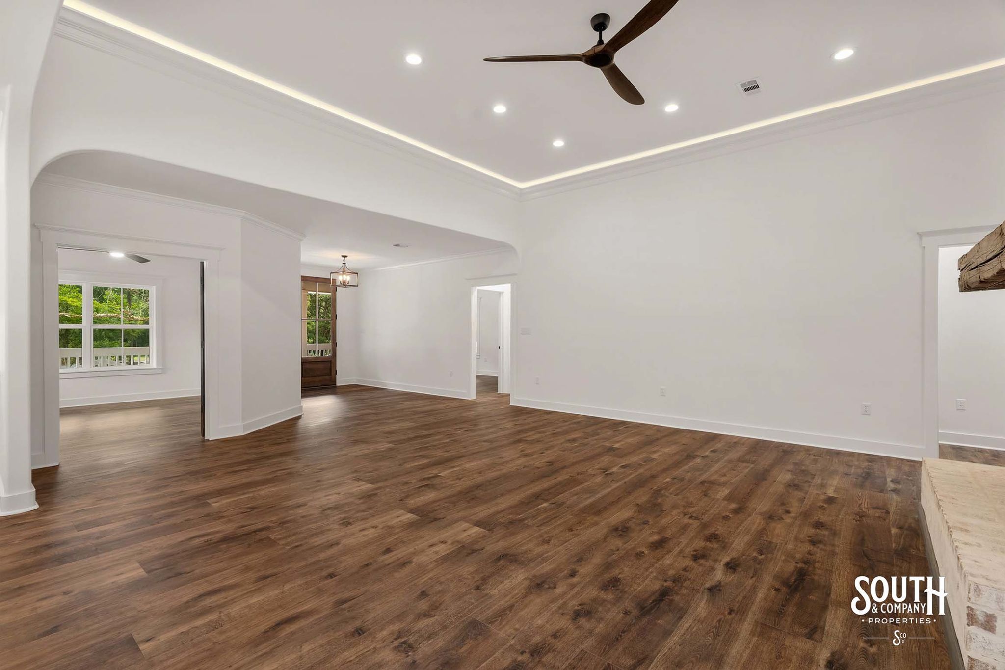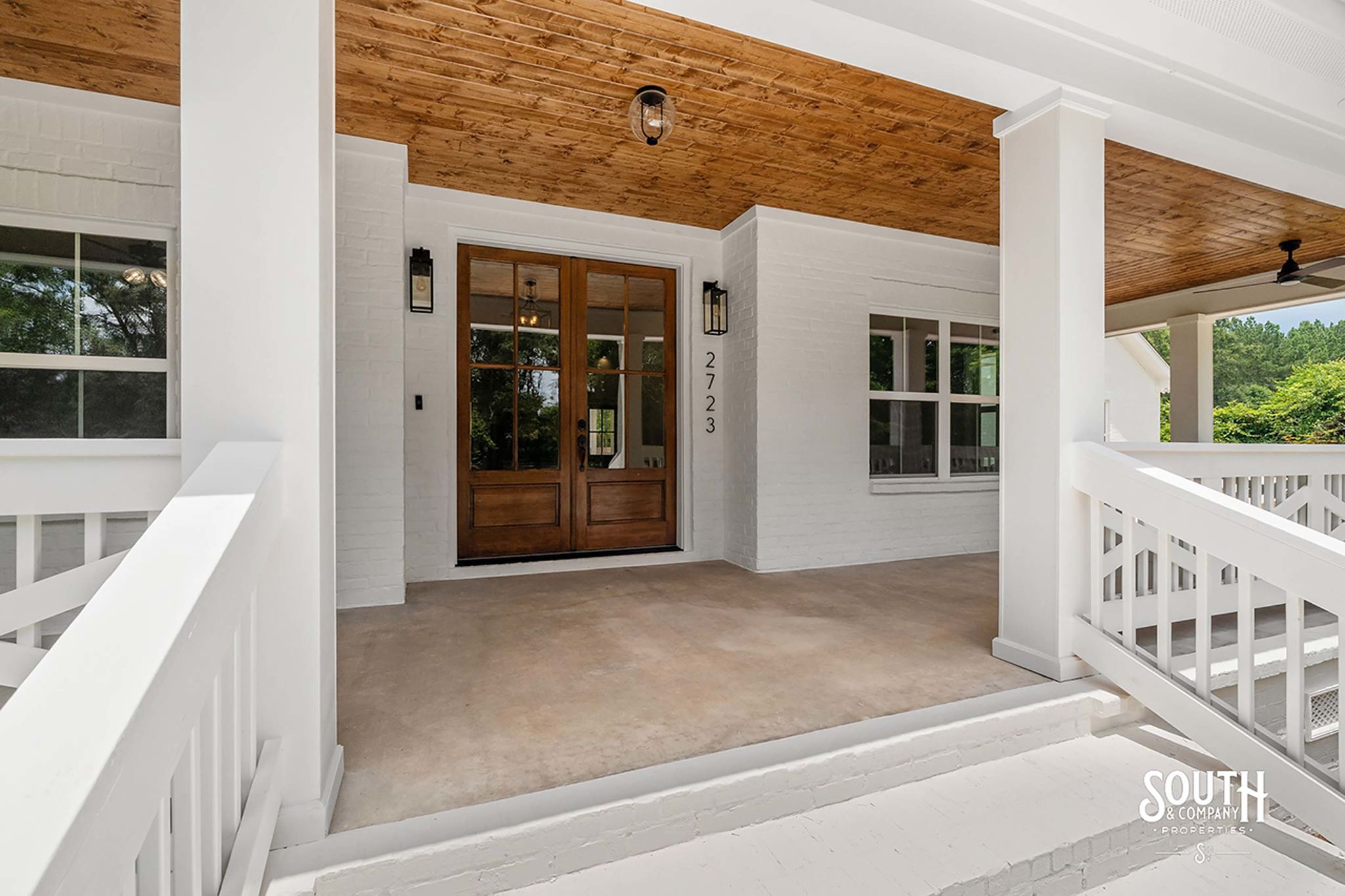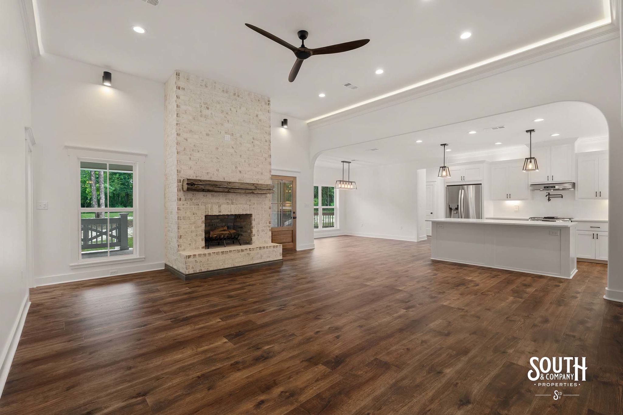 One of the home’s standout features is the outdoor living area. The spacious back porch has a vaulted tongue-and-groove ceiling and a wood burning outdoor fireplace—perfect for relaxing evenings, grilling, or entertaining friends. The front porch is equally impressive, with its elevated design, board-and-batten accents, and classic farmhouse appeal.