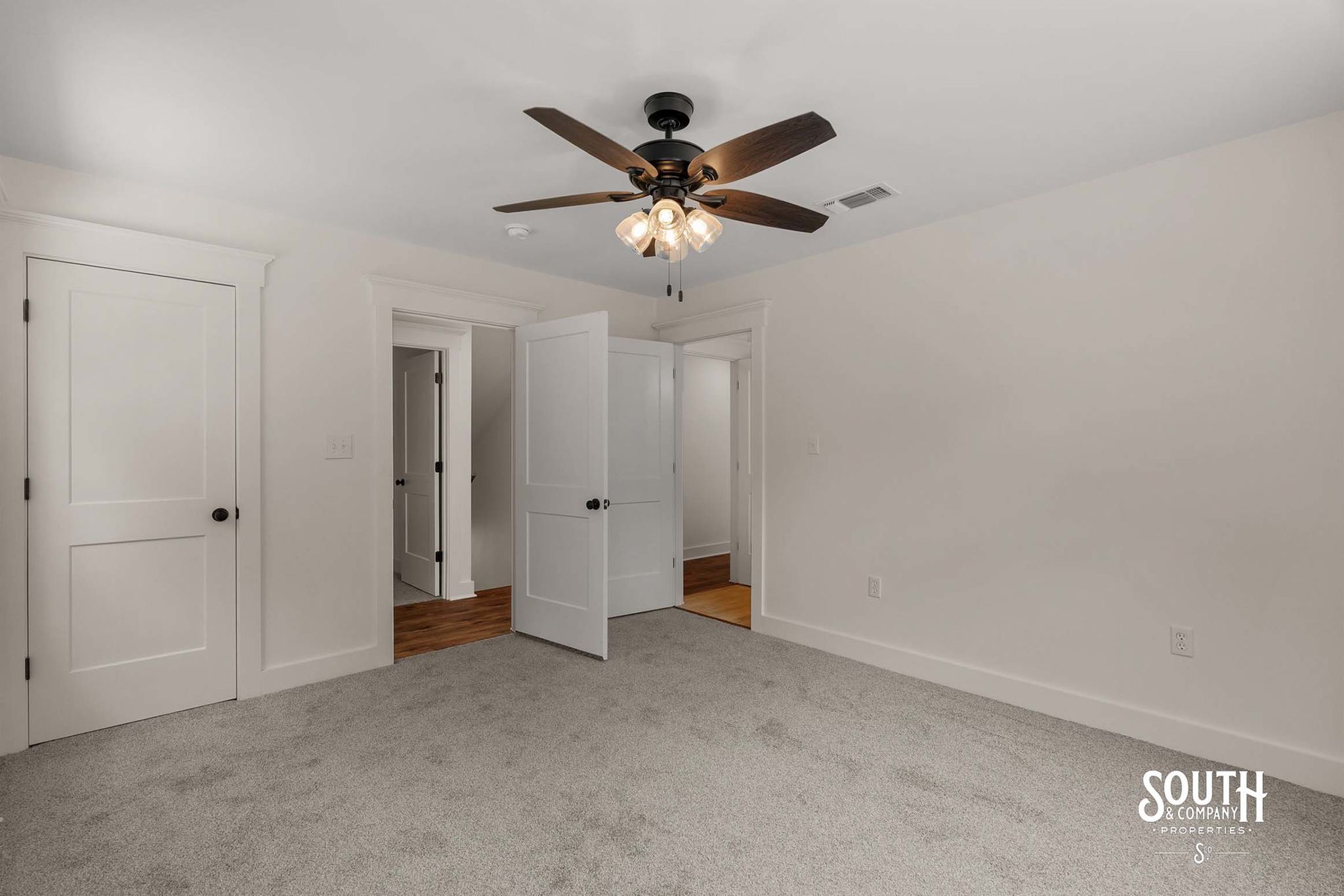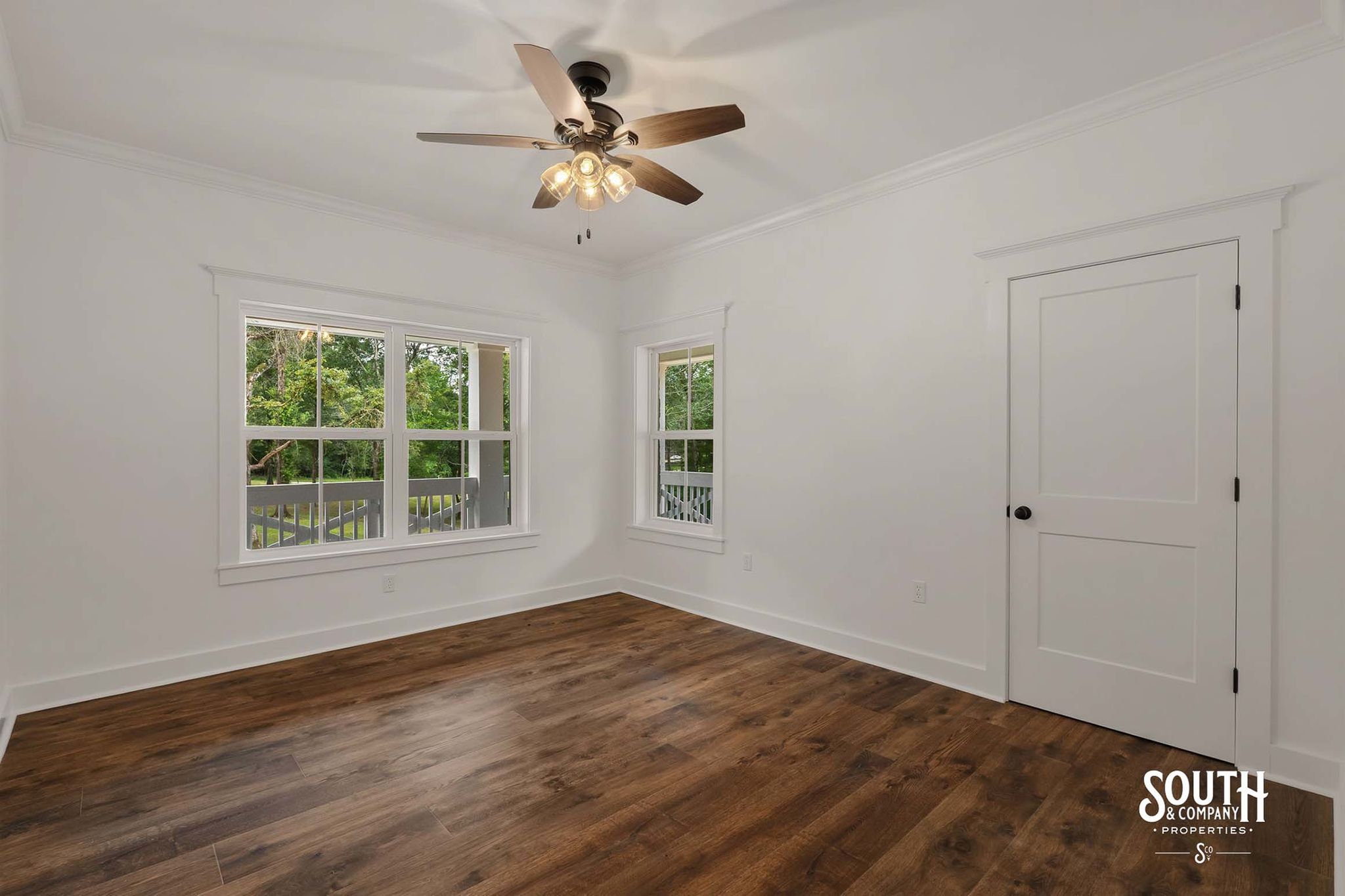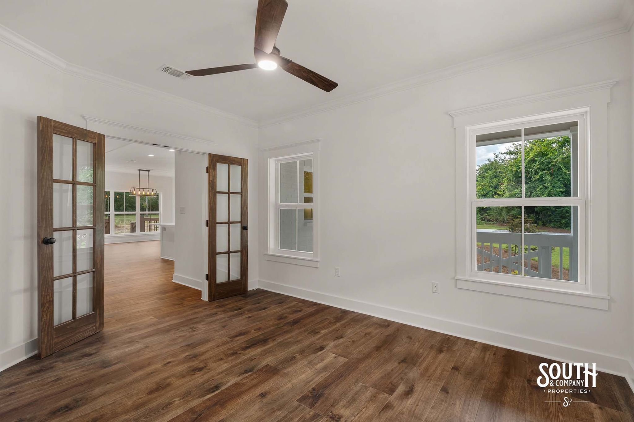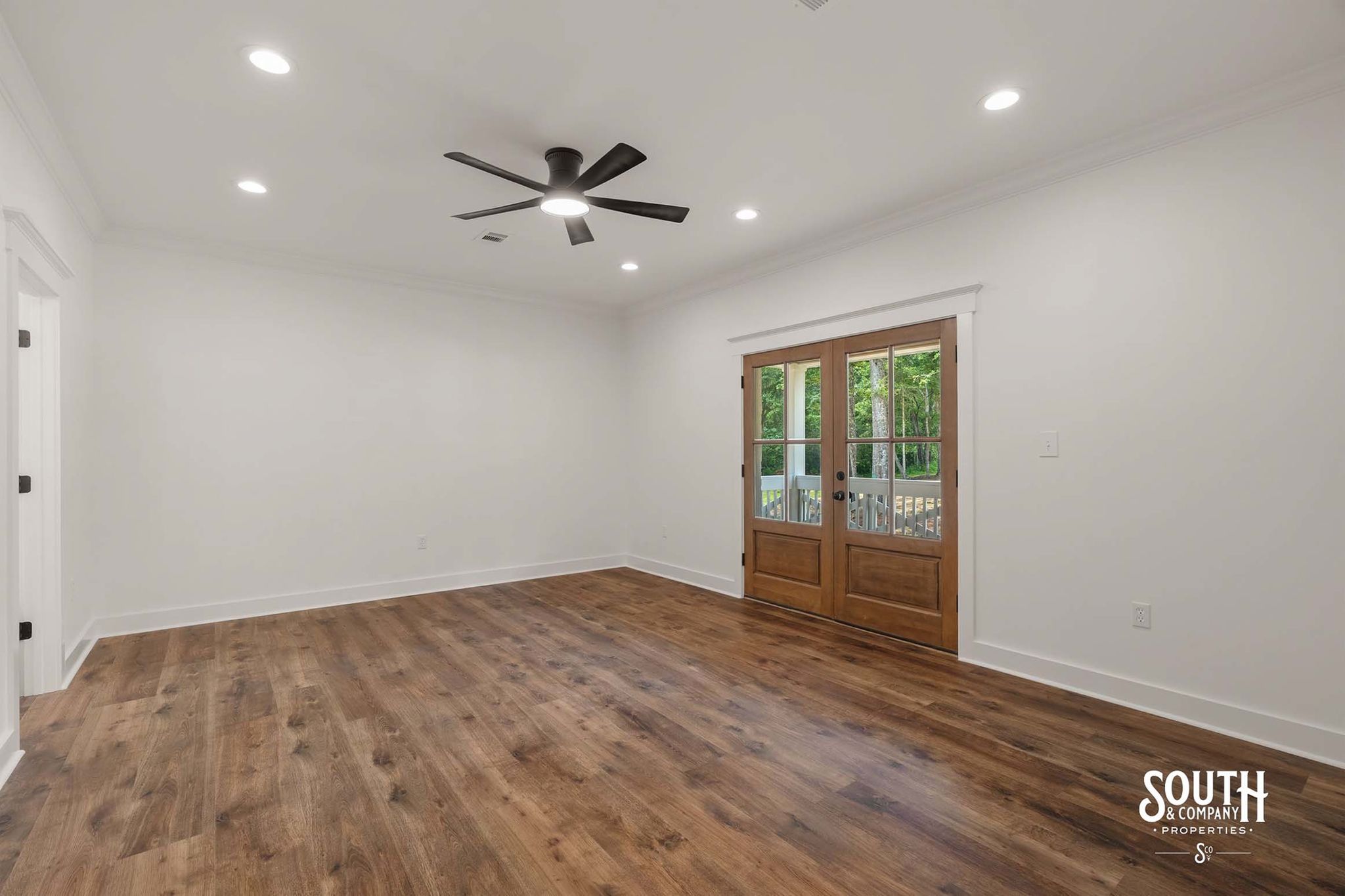 The master suite offers a retreat of its own, featuring French doors opening to the back porch, a custom-tiled shower, soaking tub, dual vanities, and a generous walk-in closet with built-ins. A second main-level bedroom provides flexible space for a home office or guest suite. Upstairs, two additional bedrooms, two full bathrooms, and a finished bonus room create options for hobbies, media, or extra sleeping space. The bonus space is equipped with close storage and can easily be used as a 5th bedroom.