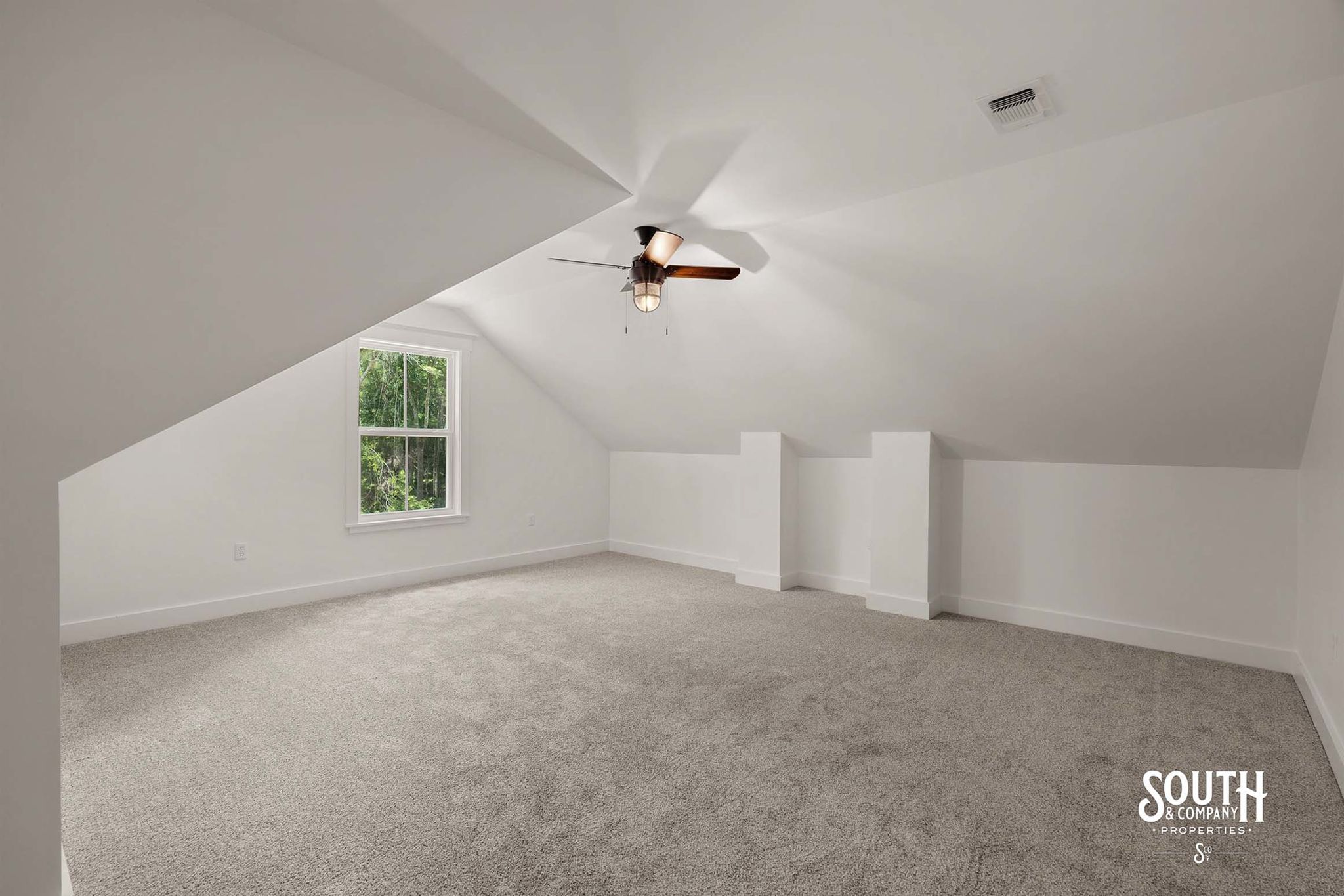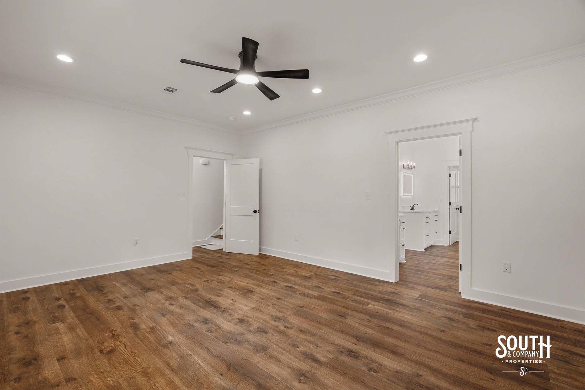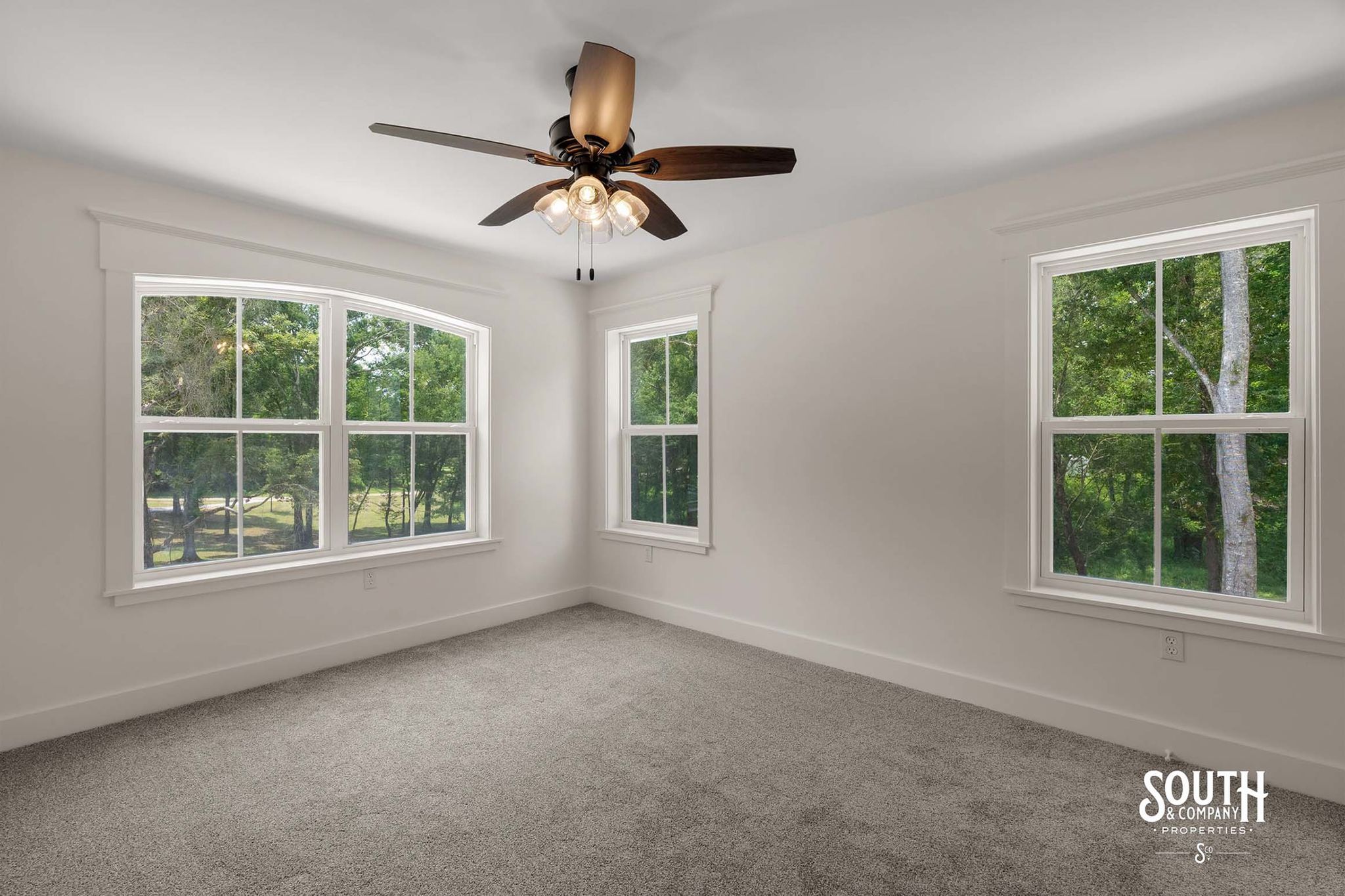 The master suite offers a retreat of its own, featuring French doors opening to the back porch, a custom-tiled shower, soaking tub, dual vanities, and a generous walk-in closet with built-ins. A second main-level bedroom provides flexible space for a home office or guest suite. Upstairs, two additional bedrooms, two full bathrooms, and a finished bonus room create options for hobbies, media, or extra sleeping space. The bonus space is equipped with close storage and can easily be used as a 5th bedroom.