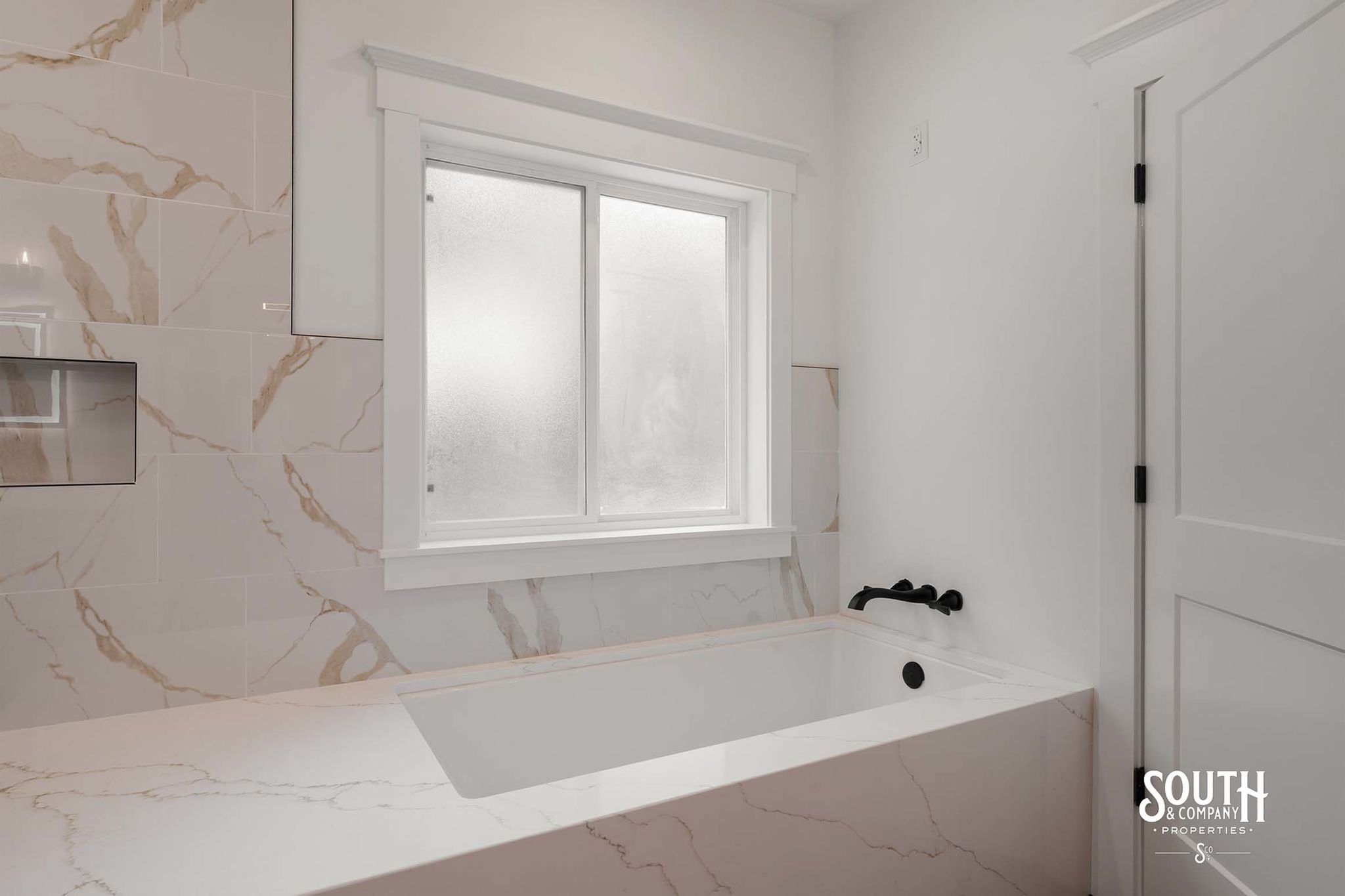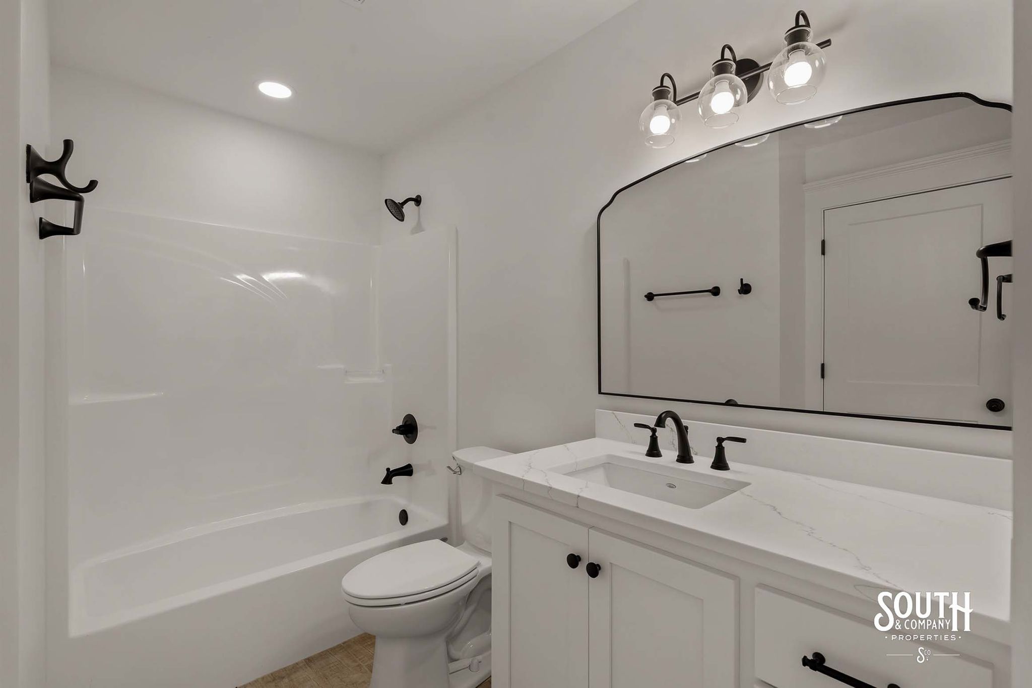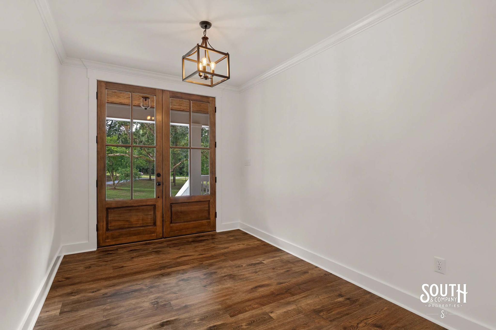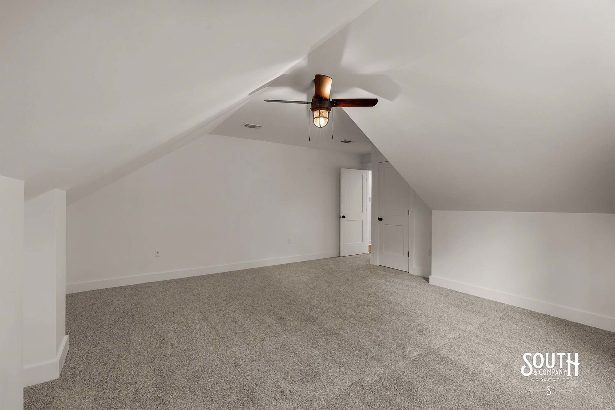 The master suite offers a retreat of its own, featuring French doors opening to the back porch, a custom-tiled shower, soaking tub, dual vanities, and a generous walk-in closet with built-ins. A second main-level bedroom provides flexible space for a home office or guest suite. Upstairs, two additional bedrooms, two full bathrooms, and a finished bonus room create options for hobbies, media, or extra sleeping space. The bonus space is equipped with close storage and can easily be used as a 5th bedroom.