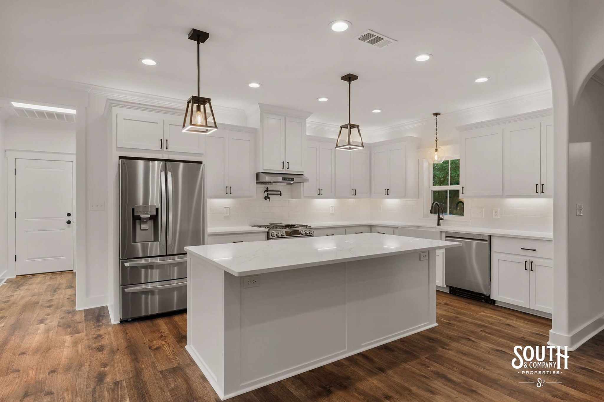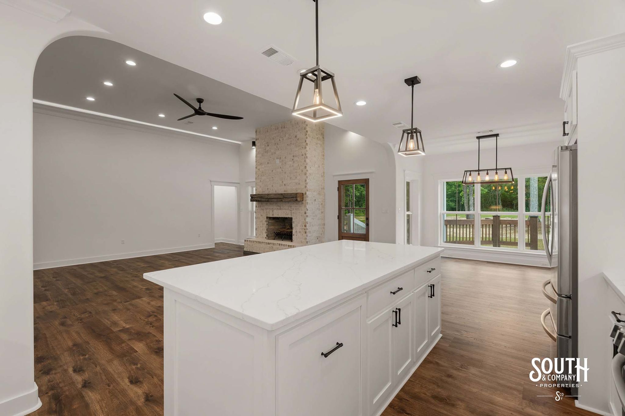 Step inside to discover an open-concept main living area perfect for gathering and entertaining. The spacious family room features a wood burning fireplace and flows seamlessly into the designer kitchen, complete with a large work island, quartz countertops, stainless steel appliances, a gas cooktop with pot filler, and an inviting breakfast nook. French doors lead to a formal dining room ideal for hosting holiday meals.